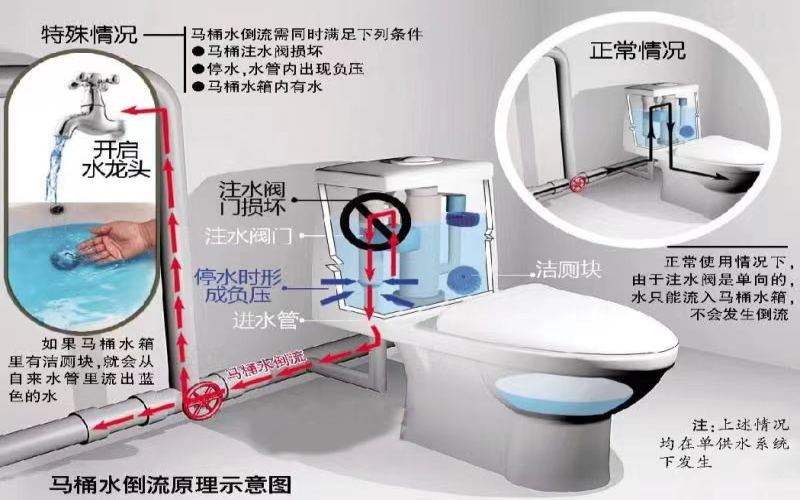 個(gè)別用戶發(fā)現(xiàn)從水龍頭中放出的自來水有時(shí)會(huì)呈現(xiàn)藍(lán)色。出現(xiàn)這種現(xiàn)象是因?yàn)橛脩粼趲鋬?nèi)放有潔廁靈(藍(lán)色),同時(shí)馬桶進(jìn)水管止回閥損壞導(dǎo)致。正常情況下,在管網(wǎng)壓力的作用下,水的流向是正向的。但由于停水或者樓下有用水,在開啟閥門或水龍頭的瞬間,由于水流的突然變化,使樓上未用水的管道內(nèi)產(chǎn)生了瞬時(shí)負(fù)壓,將水箱內(nèi)的水抽入管道內(nèi),即產(chǎn)生了藍(lán)水現(xiàn)象。只需加裝止回閥,即可解決問題。
