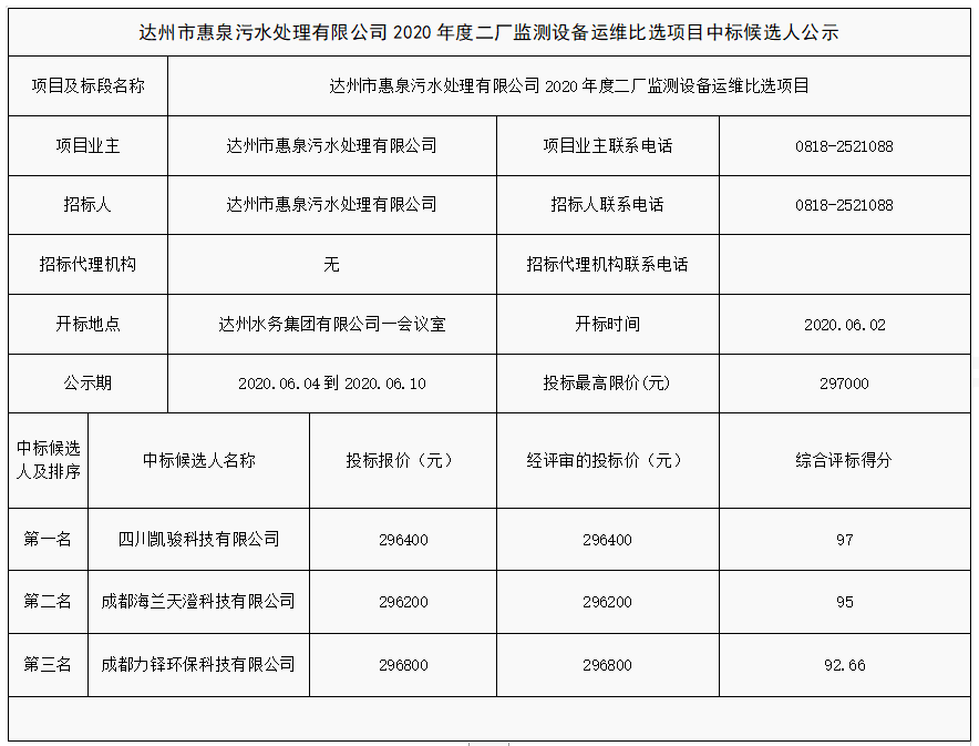 標(biāo)題:達(dá)州市惠泉污水處理有限公司2020年度二廠監(jiān)測(cè)設(shè)備運(yùn)維比選項(xiàng)目中標(biāo)候選人公示