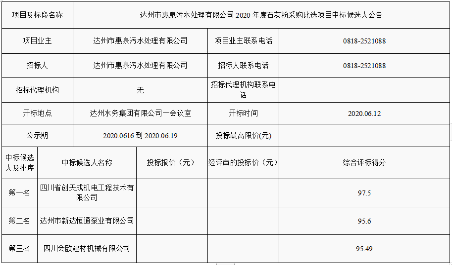 標(biāo)題:達(dá)州市惠泉污水處理有限公司2020年度石灰粉采購(gòu)比選項(xiàng)目中標(biāo)候選人公告
